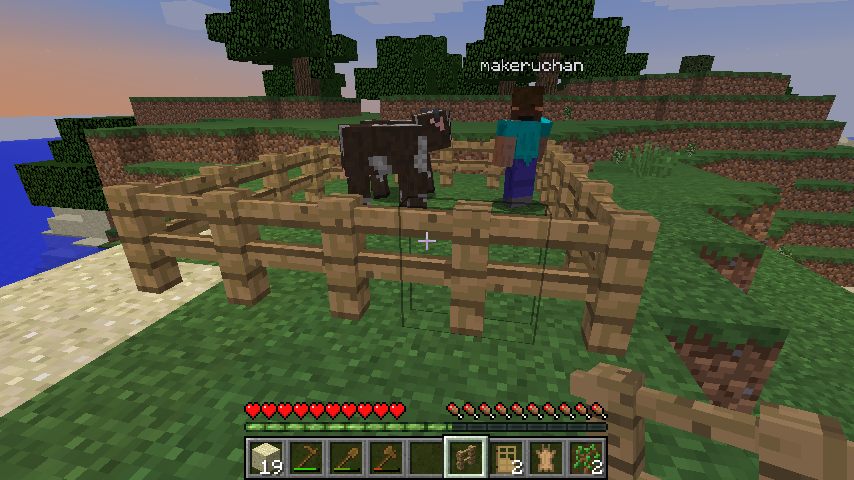 牛を集めるには手に小麦を持った状態で牛に近づくと、牛が勝手にこちらに寄ってくるので、ゆっくり誘導しながら柵の中に入れていきます。